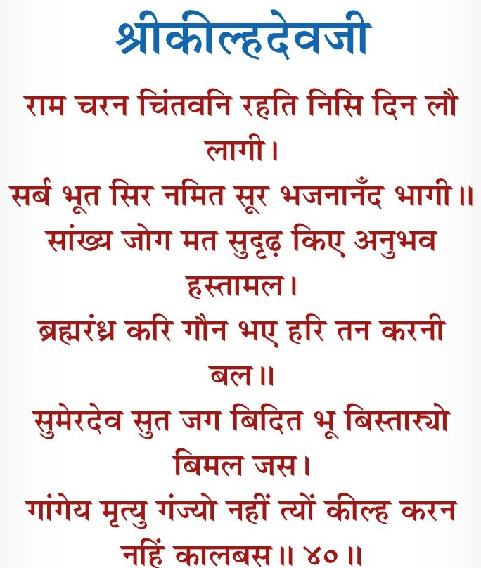 जिस प्रकार गंगाजीके पुत्र श्रीभीष्मपितामहजीको मृत्युने नष्ट नहीं किया, उसी प्रकार स्वामी श्रीकील्हदेवजी भी साधारण जीवोंकी तरह मृत्युके वशमें नहीं हुए, बल्कि उन्होंने अपनी इच्छासे प्राणोंका त्याग किया। कारण कि आपकी चित्तवृत्ति दिन-रात श्रीरामचन्द्रजीके चरणारविन्दोंका ध्यान करनेमें लगी रहती थी। आप मायाके षड्विकारोंपर विजय प्राप्त करनेवाले महान् शूरवीर थे। सदा भगवद्भजनके आनन्दमें मग्न रहते थे। सभी प्राणी आपको देखते ही नतमस्तक हो जाते थे और आप सभी प्राणियोंमें अपने इष्टदेवको देखकर उन्हें सिर झुकाते थे। सांख्यशास्त्र तथा योगका आपको सुदृढ़ ज्ञान था और योगकी क्रियाओंका आपको इतना सुन्दर अनुभव था कि जैसे हाथमें रखे आँवलेका होता है। ब्रह्मरन्ध्रके मार्गसे प्राणोंको निकालकर आपने शरीरका त्याग किया और अपने योगाभ्यासके बलसे भगवद्रूप पार्षदत्व प्राप्त किया। इस प्रकार श्रीसुमेरुदेवजीके सुपुत्र श्रीकील्हदेवजीने अपने पवित्र यशको पृथ्वीपर फैलाया, आप विश्वविख्यात सन्त हुए ॥ ४० ॥